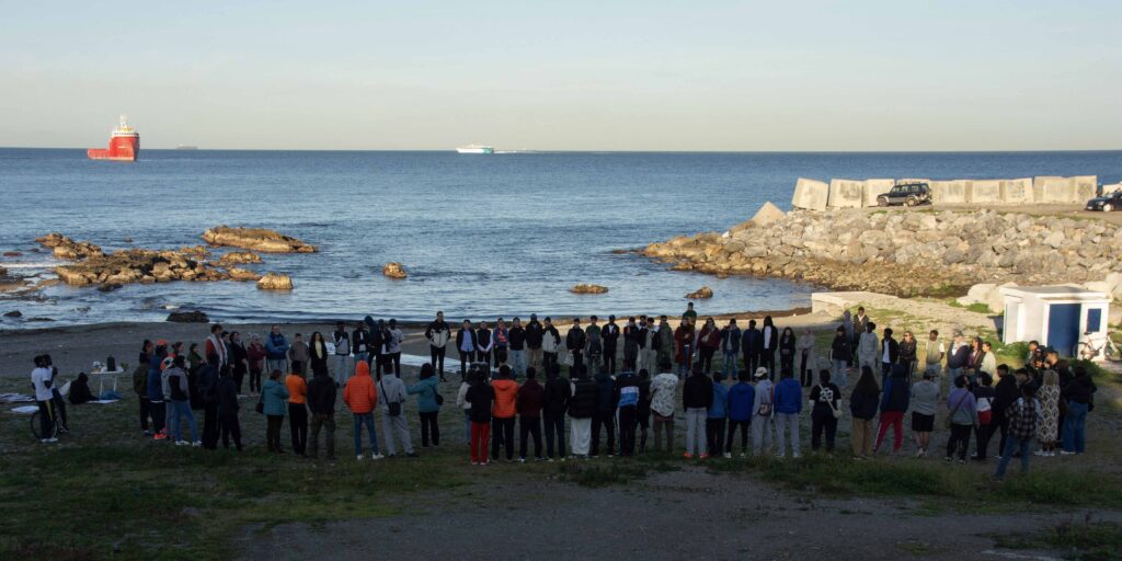 El viernes, jornada anterior a la Marcha, se realizó un taller de pancartas en la playa del Trampolín, cercana al CETI, en la que participaron tanto chicos migrantes como personas que iban llegando esos días desde la península y las personas que estábamos en Ceuta, resultando en un espacio de encuentro de gran valor cargado de nuevas relaciones y reencuentros, y un ambiente agradable que motivó la gran participación de los chicos el día siguiente.
